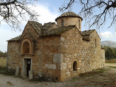 Η είσοδος του ναού είναι εξαιρετικά χαμηλή όπως και της παρακείμενης Παναγίας Μεσοσπορίτισσας. Έχει υπέρθυρο πλίνθινο τοξωτό προσκυνητάρι (ημικυκλική κόγχη πάνω από την πόρτα) το οποίο απαντάτε και σε αρκετούς άλλους αττικούς ναούς, όπως στην γειτονική Παναγία Μεσοσπορίτισσα. Στα προσκυνητάρια αυτά συνήθως εικονίζεται ο τιμώμενος άγιος. Στο υπέρθυρο της συγκεκριμένης εκκλησίας σώζονται τμήματα από τοιχογραφία.