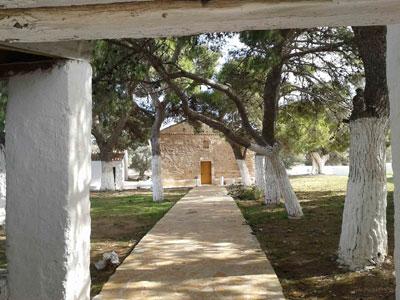 Ιδιαίτερο είναι και το κτιστό τέμπλο του με τα εντοιχισμένα παλαιοχριστιανικά γλυπτά, καθώς και το δίδυμο προσκυνητάρι μπροστά στο βόρειο τμήμα του, το οποίο αποτελείται από δύο μονόλιθους, ραβδωτούς κορμούς κιόνων με διακοσμημένα κιονόκρανα, με φύλλα καλάμου και άκανθας. Το τέμπλο αυτό, έχει χρονολογηθεί από στους βυζαντινούς χρόνους.